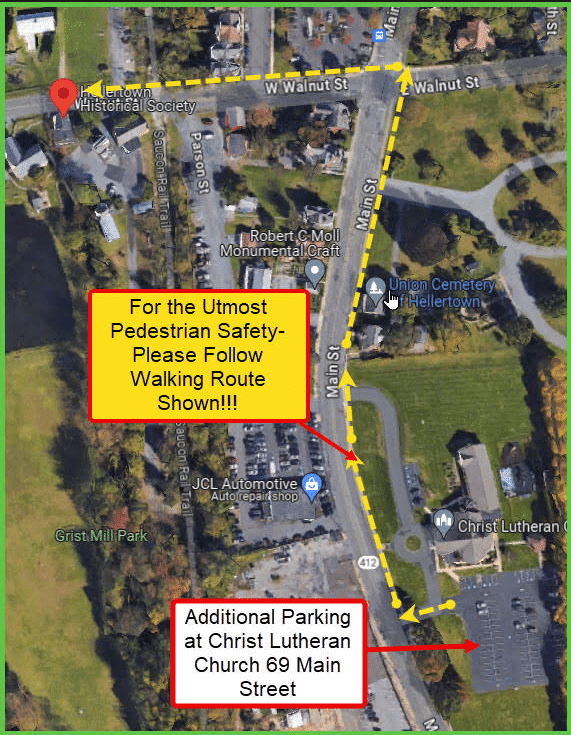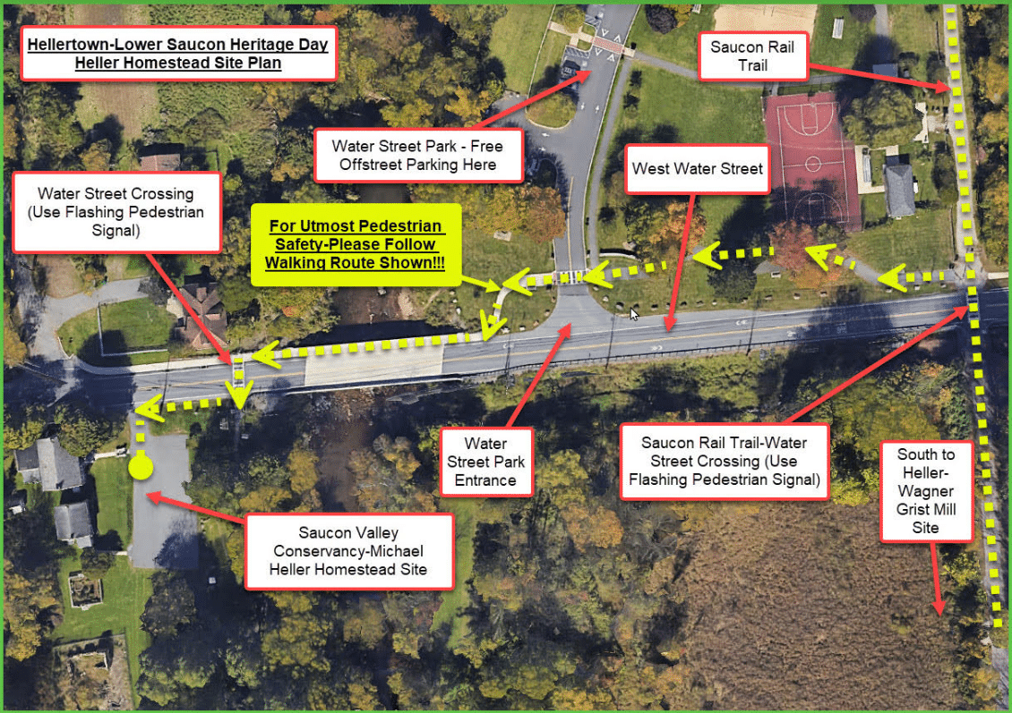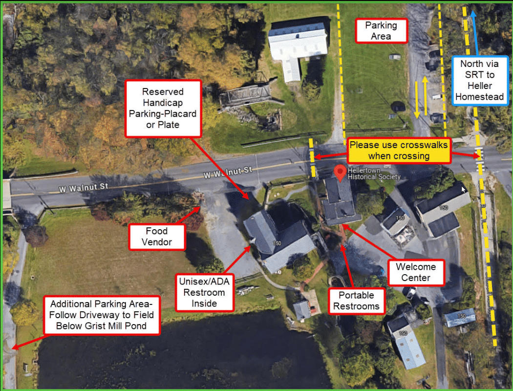 The event will feature educational activities, live animals, antique cars, food, carriage rides, walking tours, “Hellertown Through Time” presentations and more (a complete list of scheduled activities and locations appears below). Off-street parking will be available at both locations, including in Water Street Park, for visitors to the homestead. Overflow parking for the grist mill will be available in the Christ Lutheran Hellertown lot at 69 Main Street (see the maps below for directions on where to park). Guests are being encouraged to use the pedestrian crossing safety devices available at the traffic light at Walnut and Main streets, and if they are crossing Water Street near the park to reach the homestead.