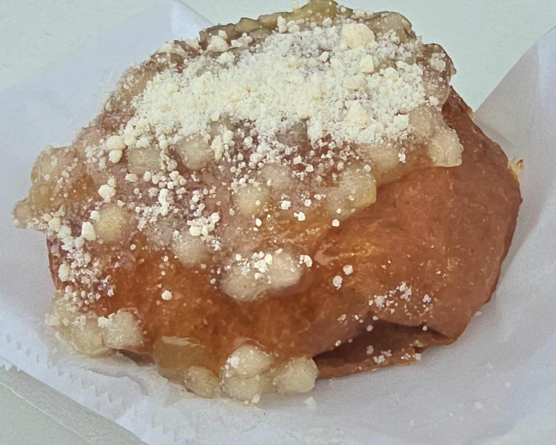 On Saturday Aloha Jay’s was selling an apple crumb malasada as a featured flavor. Its regular lineup of malasadas includes unusual flavors like coconut cream, ube (purple yam) and snow cap cream as well as sugar and cinnamon coated, custard and s’mores.