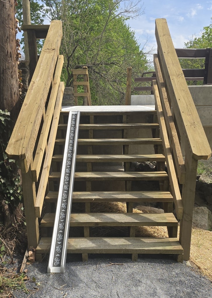 Those using the D&L Trail in the area of Canal Road must cross the bridge to continue north or south on the trail. New wooden steps connecting the trail to the bridge feature metal guide rails to help cyclists pull their bikes up or down the steps.