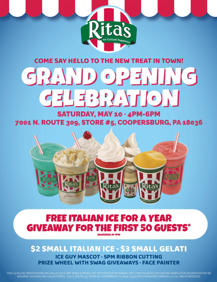 Rita’s at 7001 N. Rt. 309, Store #5 will hold an opening celebration for customers this Saturday, May 10 from 4 to 6 p.m. The store held a soft opening last year.