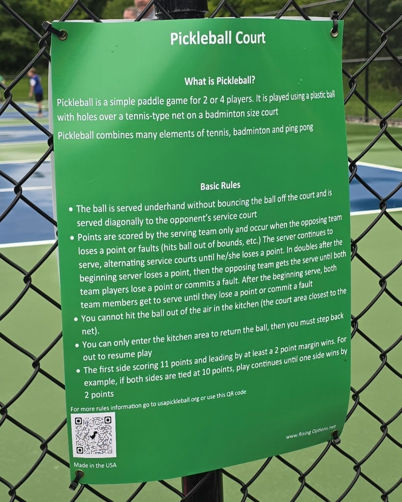 A sign attached to the fence surrounding the pickleball courts explains what the game is and lists some basic rules of play and scorekeeping.