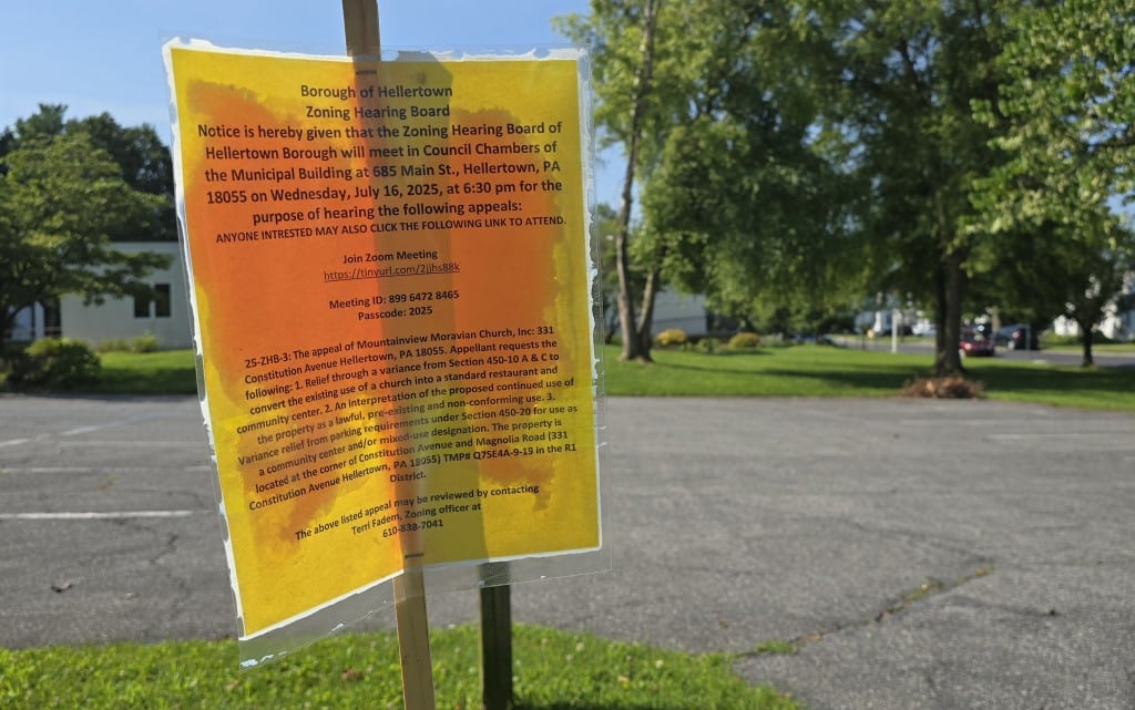 The Hellertown Zoning Hearing Board meeting will be held in the council meeting room on the second floor of Borough Hall as well as livestreamed on Zoom (meeting ID: 899 6472 8465, passcode: 2025). Residents who wish to review documents related to the appeal beforehand can do so by contacting borough zoning officer Terri Fadem at 610-838-7041.