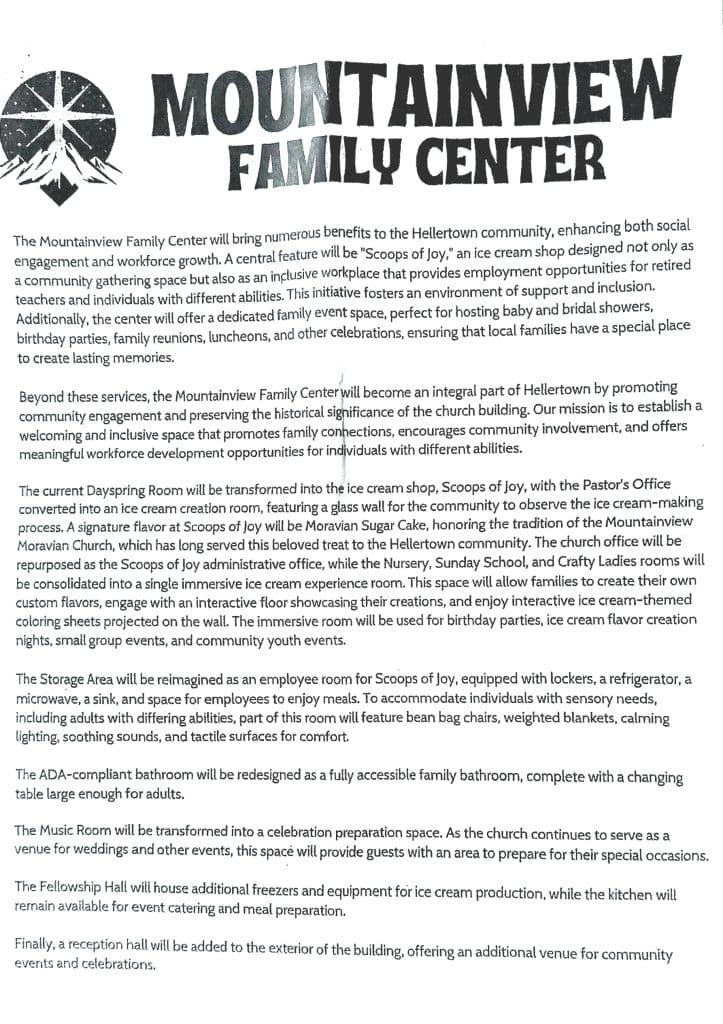 According to a Mountainview Moravian Church Inc. press release about the plans, the Mountainview Family Center would benefit the community as a place that provides employment to individuals with different abilities and retirees.