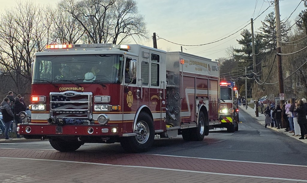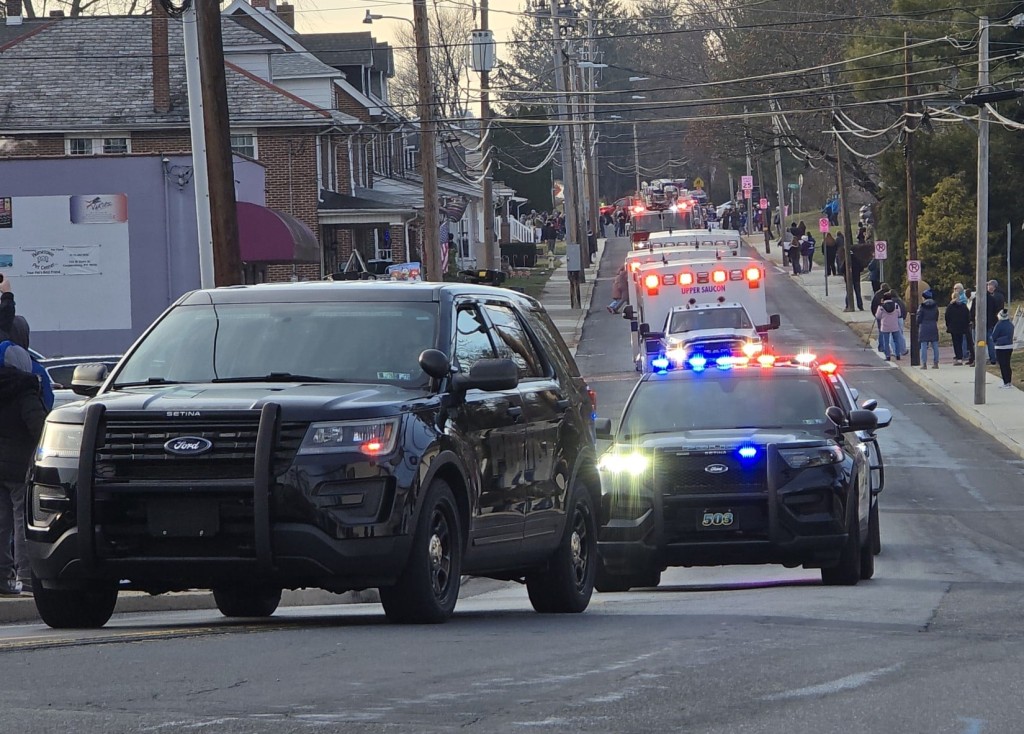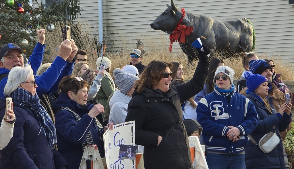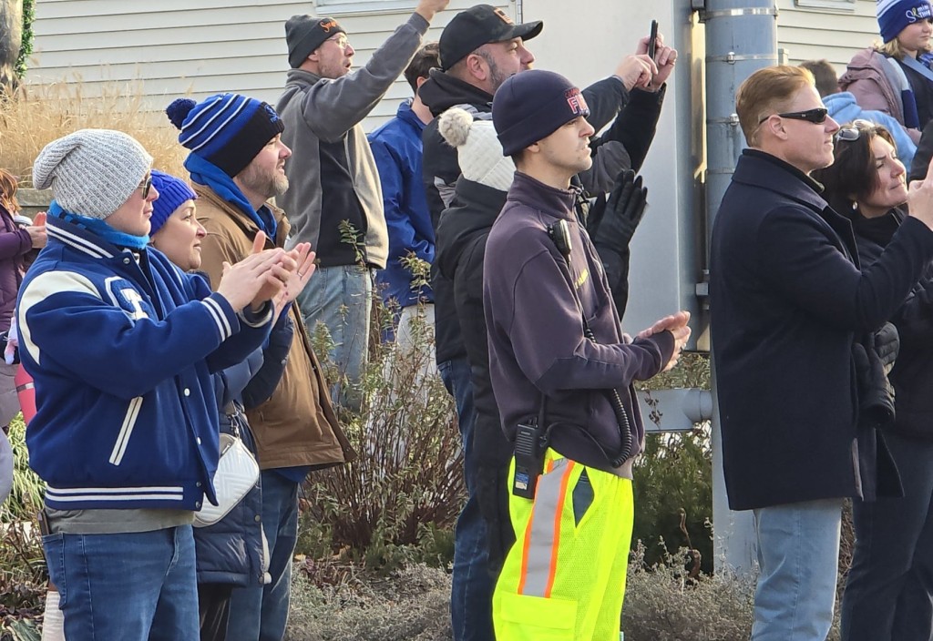 The parade began at Liberty Bell Elementary School and ended at the Town Center Park opposite Borough Hall, where the ceremony was held. In addition to the championship team, Southern Lehigh Middle School and Southern Lehigh Youth Football Association players and cheerleaders marched in the parade, which was led by a cacophonous convoy of Coopersburg and Upper Saucon Township firetrucks, police cars and ambulances. A number of fans who lined the parade route rang cowbells, which are symbolic in Coopersburg, given the community’s history as a premier Jersey cattle auction site.