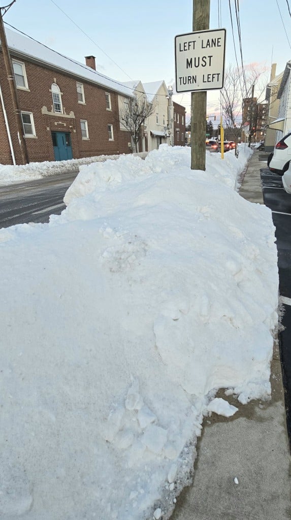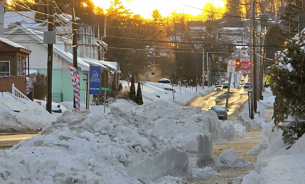 Much of the Allentown-Bethlehem-Easton area saw close to a foot of frozen precipitation on Sunday. Schools were closed throughout the region Monday and snow emergencies remained in effect in most municipalities, including the Borough of Hellertown. Borough officials said the snow emergency there would remain in effect until 5 p.m. Tuesday to give public works crews time for additional snow clearing. All along Main Street walls of compacted snow separated the road from sidewalks.