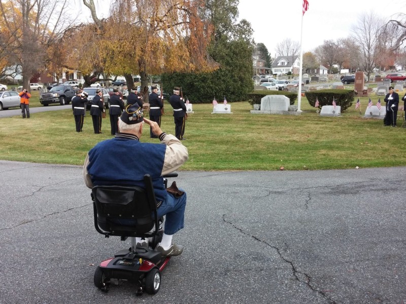 Hellertown's Edward H. Ackerman American Legion Post 397 held a moving Veterans Day ceremony at Union Cemetery Tuesday. Dozens of people attended the event, which included remarks by Legion Commander Geoffrey Baer, Hellertown Mayor Richard Fluck and State Rep. Bob Freeman (D-136), bagpipes, a patriotic medley performed by members of the Saucon Valley High School Band, and the presentation of pins to all of the veterans in attendance.